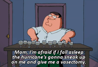 Mom, I'm afraid if I fall asleep the hurricane's gonna sneak up on me and give me a vasectomy.