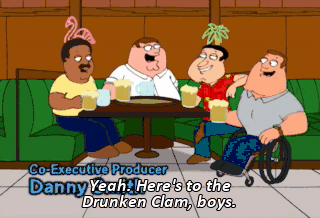Yeah. Here's to the Drunken Clam, boys. Where they don't ask for proof of age, and neither do I.