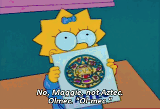 No, Maggie, not Aztec. Olmec. "Ol-mec."