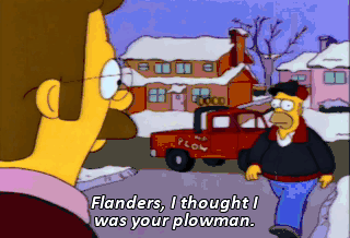 Flanders, I thought I was your plowman. Uh, Homer, why don't you plow it again? Forget it, pal. I don't need your phony-baloney job. I'll take your money, but I'm not gonna plow your driveway.