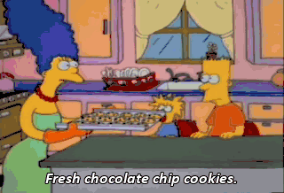 Fresh chocolate chip cookies. Oh! Don't touch those yet. They're very, very hot. Aha! No one's around. The perfect crime. Yow!