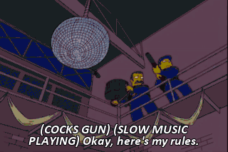 (COCKS GUN) (SLOW MUSIC PLAYING) Okay, here's my rules. Hands at 10 and two, no eye contact and I don't want to hear how pretty I look. Don't worry. You won't. D'oh! (GRUNTING)