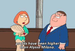 profits have been higher than Alyssa Milano. What kind of cheap shot... Joel! I'm suing. I'm suing. I'm on it. I'm on it. Mr. Griffin, Time for your speech.