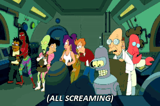 (ALL SCREAMING) (ZAPP YODELING OVER INTERCOM) (SHUDDERS) FARNSWORTH: And so, as you and Leela kissed goodbye in a tender display of tonguesmanship, we plunged into a massive wormhole, never to be seen again.