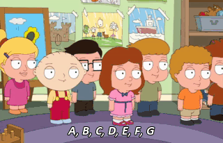 A, B, C, D, E, F, G H, I, J, K, L, M, N, O, P (STEWIE MUMBLING) Q, R, S, T, U, V Standing here with these kids W, X, Y and Z Waiting for the song to end