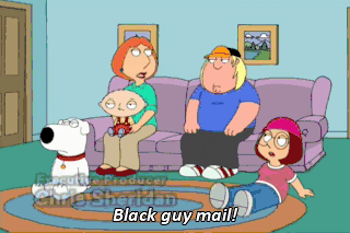 Black guy mail! Peter, you're just supposed to pick up Cleveland's mail, not go through it. Lois, black people are different than you and I.