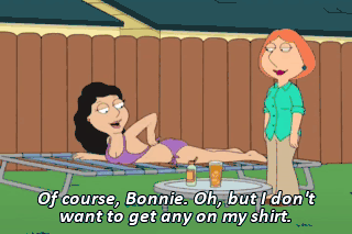 Of course, Bonnie. Oh, but I don't want to get any on my shirt. Mmm... That feels good. Um, you're going a little low there, Lois. (CHUCKLING) Okay. I'm sorry.