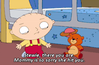 Stewie, there you are. Mommy is so sorry she hit you. I promise I will never lay a hand on you again.