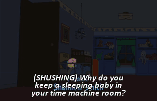 (SHUSHING) Why do you keep a sleeping baby in your time machine room? I don't know, my decorator's terrible. (ELECTRICAL WHIRRING)