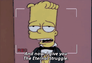 And now, I give you The Eternal Struggle. Relaxed fit, my Aunt Fanny! Stupid Dockers! Oh. The belt is buckled. Now, Maude, in our movie,