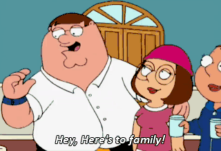 Hey, Here's to family! To family! Oh, Jeez, look at the time! Come on. Come on, kids. Let's get going. Aw, Sorry, Meg.