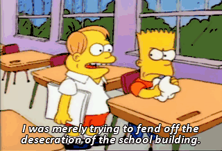 I was merely trying to fend off the desecration of the school building. - Eat my shorts. - Pardon ? Now, I don't want you to worry, class.