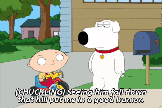 (CHUCKLING) Seeing him fall down that hill put me in a good humor. Stewie, get lost.