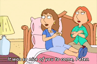 It was so nice of you to come, Peter. You're so considerate. Aw, It was nothing.