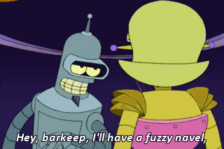 Hey, barkeep, I'll have a fuzzy navel, and she'll have the girliest drink in the house. Two fuzzy navels comin' up.