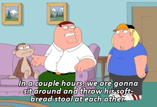 In a couple hours, we are gonna sit around and throw his soft-bread stool at each other.