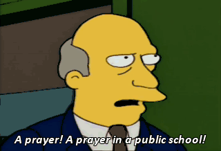 A prayer! A prayer in a public school! God has no place within these walls, just like facts have no place within organized religion! Simpson, you get your wish. Flanders is history.