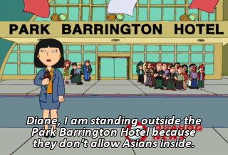 Diane, I am standing outside the Park Barrington Hotel because they don't allow Asians inside.