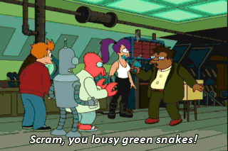 Scram, you lousy green snakes! Here, Leela. Take this and use it to shoot those guys. Right. If they try to look in the box. Whatever. Let's just forget about the box.