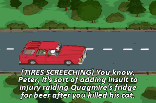 (TIRES SCREECHING) You know, Peter, it's sort of adding insult to injury raiding Quagmire's fridge for beer after you killed his cat. "Or is it?" is my response.