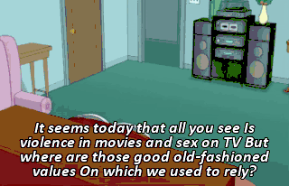 It seems today that all you see Is violence in movies and sex on TV But where are those good old-fashioned values On which we used to rely? Lucky there's a family guy Lucky there's a man who positively can do