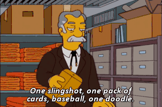 One slingshot, one pack of cards, baseball, one doodle. (READING)