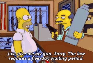 just give me my gun. Sorry. The law requires a five-day waiting period. We've got to run a background check. Five days? But I'm mad now!
