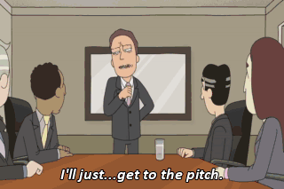 I'll just...get to the pitch. Um, simple question, gentlemen, what are apples? Excuse me. Ahh, What are apples? Apples are food. And...when do we need food? When we're hungry.