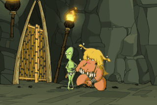 Be gentle! Yahoo! We've got to do something. Bender, maybe you can interface with the Femputer... and reprogram it to let them go. Maybe you can interface with my ass... by biting it!