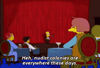 Heh, nudist colonies are everywhere these days. I'd love to go, but I-- I can't get the wrinkles out of my birthday suit.
