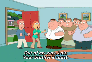 Out of my way, Lois. Your brother is toast. Warm buttery toast! (ALL MOANING) - That sounds good. I love toast. I just found my penis. Run, Patrick, run! After him! Boys, to your Rascals!