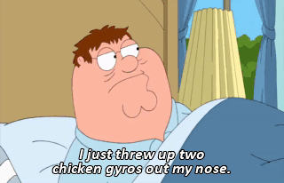 I just threw up two chicken gyros out my nose. They're on your side of the bed.