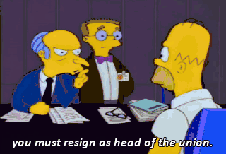you must resign as head of the union. Whoo-hoo! Smithers, I'm beginning to think that Homer Simpson... was not the brilliant tactician I thought he was.