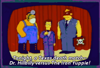 Tonight, a Texas death match-- Dr. Hillbilly versus The Iron Yuppie!