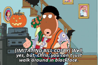(IMITATING BILL COSBY) Well, yes, but, Chris, you can't just walk around in blackface. It's racist. Now, go upstairs and put on that Indian chief costume I bought you. I don't want to! (GRUMBLING)
