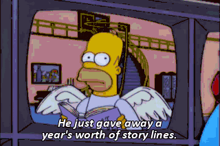He just gave away a year's worth of story lines. Cut him off... now. Yes! What the hell are you doing?