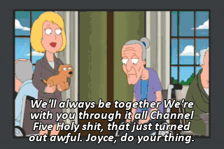 We'll always be together We're with you through it all Channel Five Holy shit, that just turned out awful. Joyce, do your thing.