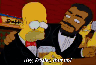 Hey, Frazier, shut up! You been riding my back all night. Oh, yeah? Care to step outside? Let's do it. I think I'm going to take a walk.