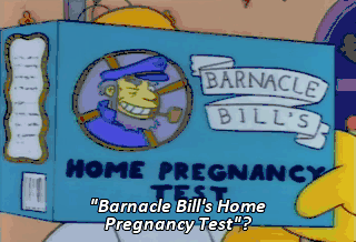 "Barnacle Bill's Home Pregnancy Test"? Homer, shouldn't we have gone with a better-known brand? But, Marge, this one came with a free corncob pipe.