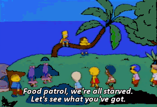 Food patrol, we're all starved. Let's see what you've got. That's it? What happened to all the lobsters, mangoes and chewy, chewy cocoa beans?