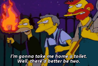 I'm gonna take me home a toilet. Well, there'd better be two. Who is it? Uh, it's an angry mob, ma'am. Could you step outside for a twinkle while we knock down your house? Just a minute.