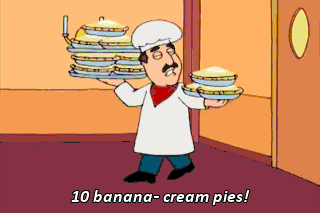 10 banana- cream pies! Oh! Holy crap! This is hot! Oh!