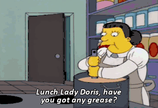 Lunch Lady Doris, have you got any grease? Yes. Yes, we do. Then grease me up, woman! Okeydokey.