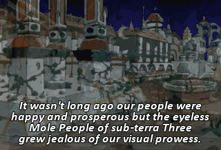 It wasn't long ago our people were happy and prosperous but the eyeless Mole People of sub-terra Three grew jealous of our visual prowess.