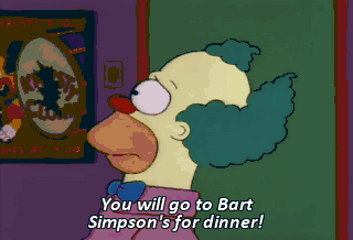 You will go to Bart Simpson's for dinner! But I have plans. Hey! Not the face! Why you maddening, impossible man! If you don't go tonight I won't be here tomorrow.
