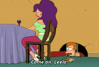 Come on, Leela. You deserve better than this guy. Dump him already. I'm trying. Hey, everyone, jam a sock in your spit faucets.