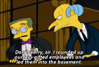 Don't worry, sir. I rounded up our less-gifted employees and led them into the basement. Duh, Homer, why are we down here? Oh, geez! I told ya, Bernie-- to guard the bee!