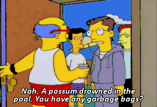 Nah. A possum drowned in the pool. You have any garbage bags?