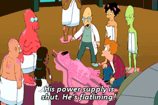 His power supply is shut. He's flatlining! (BEEPING) Only one thing can keep him alive. Possibly this thing. (POWER SURGING)