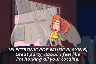 (ELECTRONIC POP MUSIC PLAYING) Great party, Raoul. I feel like I'm horking all your cocaine. Hey, that's okay, Lois. You can just buy the next bag, eh? Right, other guy? Oh, I couldn't afford that.